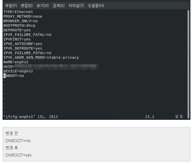 (주의, 일반적으로 기본 유선 네트워크 설정 파일은 ifcfg-enp0s3이지만 시스템 구성 환경에 따라 달라질 수 있음)
