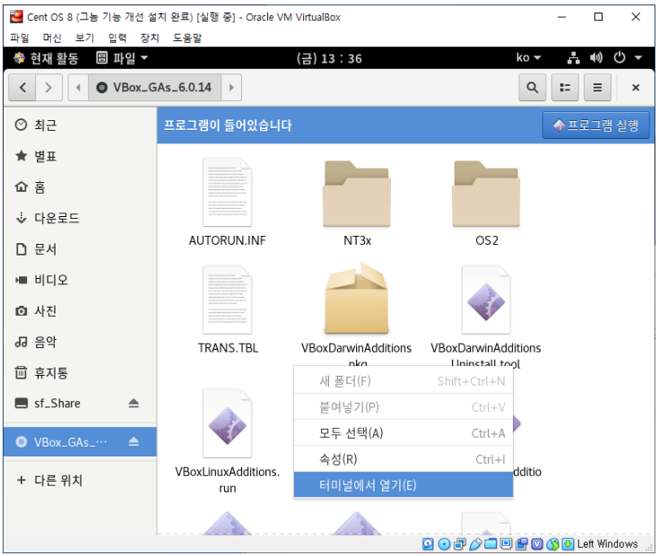 9. VBoxLinuxAdditions.run을 실행하기 위해서 해당 경로에서 터미널을 열어준다.