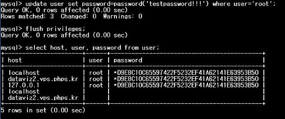 한번에 모든 root에 비밀번호를 설정하고 싶다면 아래의 update문을 이용한 비밀번호 설정을 해주면 된다.