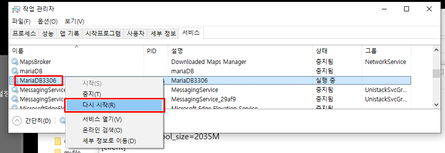 3) 작업관리자 - 서비스를 열어 MariaDB를 재시작 해준다.