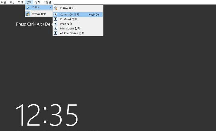 9. 설치 완료 후 재부팅하면 아래의 화면에서 Ctrl + Alt + Delete를 눌러라는데 아무리 눌러도 안될 것인데, 당연히 VM이라서 이 입력값을 전송해줘야 한다.