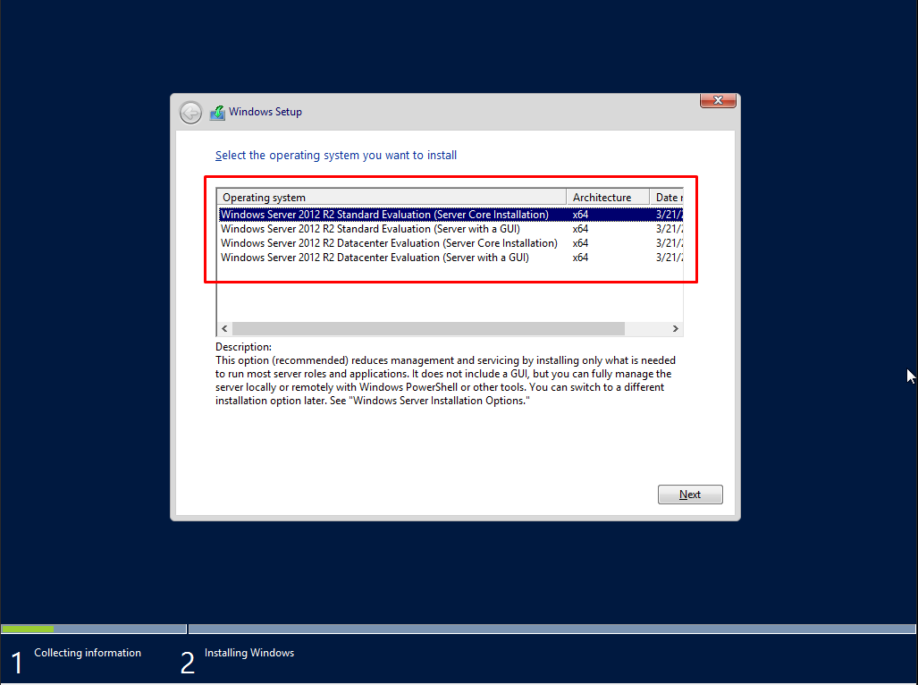 "Windows Server 2012 R2 Standard Evaluation (Server with a GUI)"로 선택하고 세팅 할 예정이다.