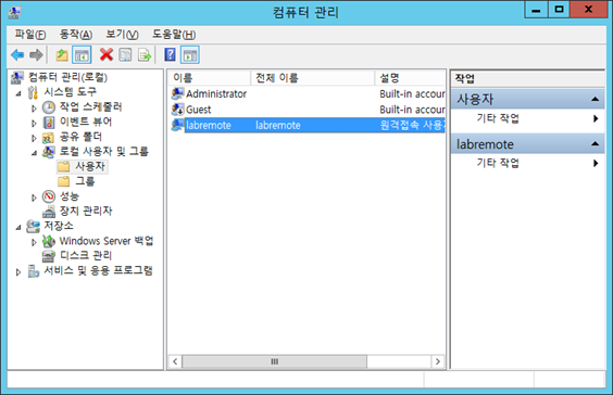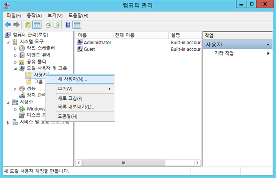 "로컬 사용자 및 그룹"에서 사용자를 선택 한 후 오른족 마우스 클릭