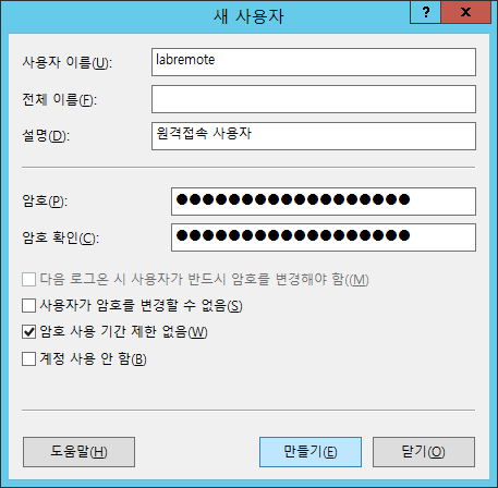 4. 만들기를 누르면 사용자가 만들어질 것이다. 아마 창은 안닫힐 것이다. "닫기"를 눌러준다.