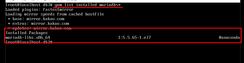 "yum list installed mariadb\*"을 입력하여 확인 한 결과, 아래의 그림과 같이 이미 설치가 되어 있음을 확인 할 수 있다.