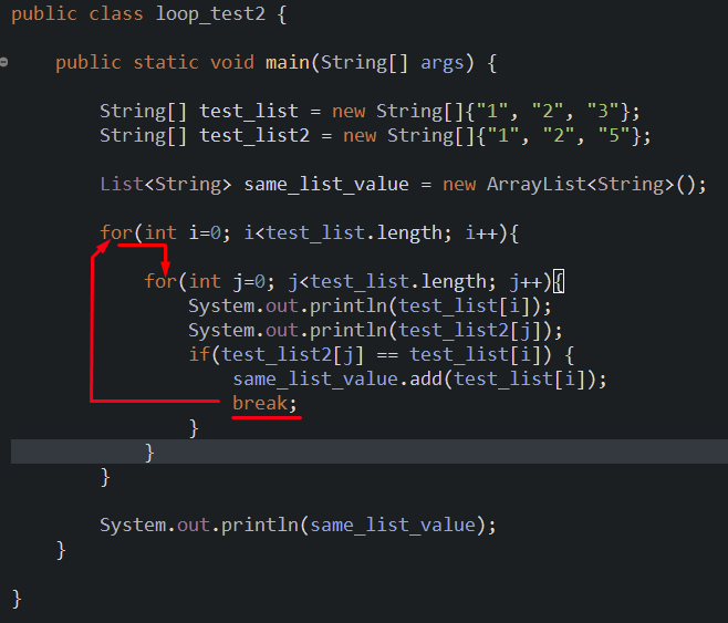 - 기존 우리가 알던 break는 해당 루프만 탈출하게 되고 위에 루프가 있다면 그 루프를 돌게된다.