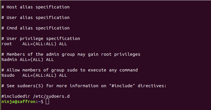 스크린샷에서 볼 수 있듯, 대부분의 리눅스 배포판에서 /etc/sudoers 파일의 RunAs 사양 내 ALL 키워드는 디폴트로 admin 또는 sudo 그룹의 모든 사용자가 시스템의 유효한 사용자로써 모든 명령어를 실행할 수 있도록 허용합니다.