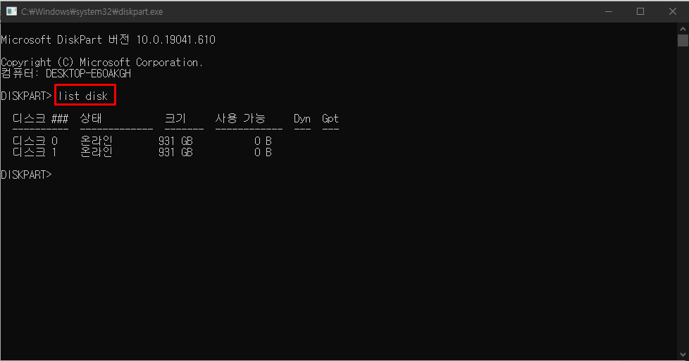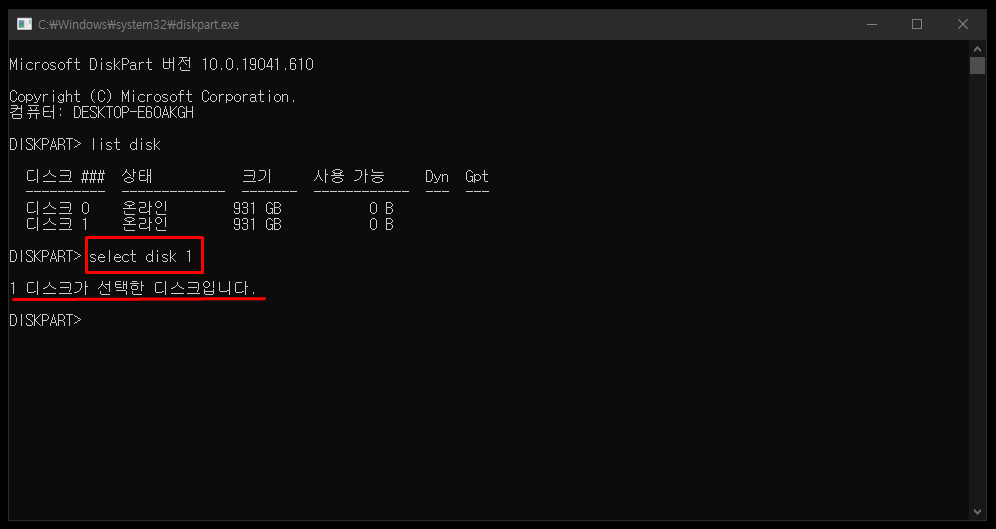 3. 하드디스크 안전하게 제거하기가 안되는 디스크를 선택해준다. 나의 경우에는 "디스크 1"이 안전하게 제거가 안되었는데 여기서 "select disk 1"을 입력하면 된다.