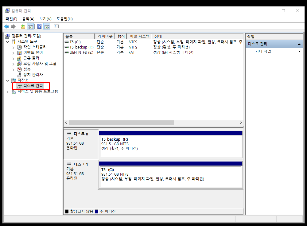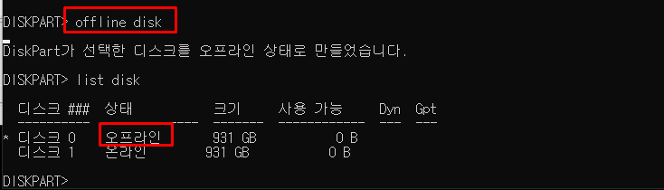 3. 디스크를 선택한 뒤 우클릭을 이용하여 "오프라인"으로 설정하면 된다.