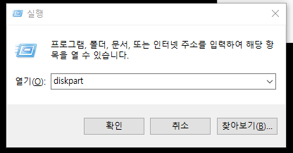 1. "Win + R"을 눌러 "diskpart"를 입력한다.