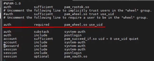 # "vi /etc/pam.d/su" 를 입력하게 되면 아래 그림을 참고하여 빨간 부분에 주석을 제거하면 된다.