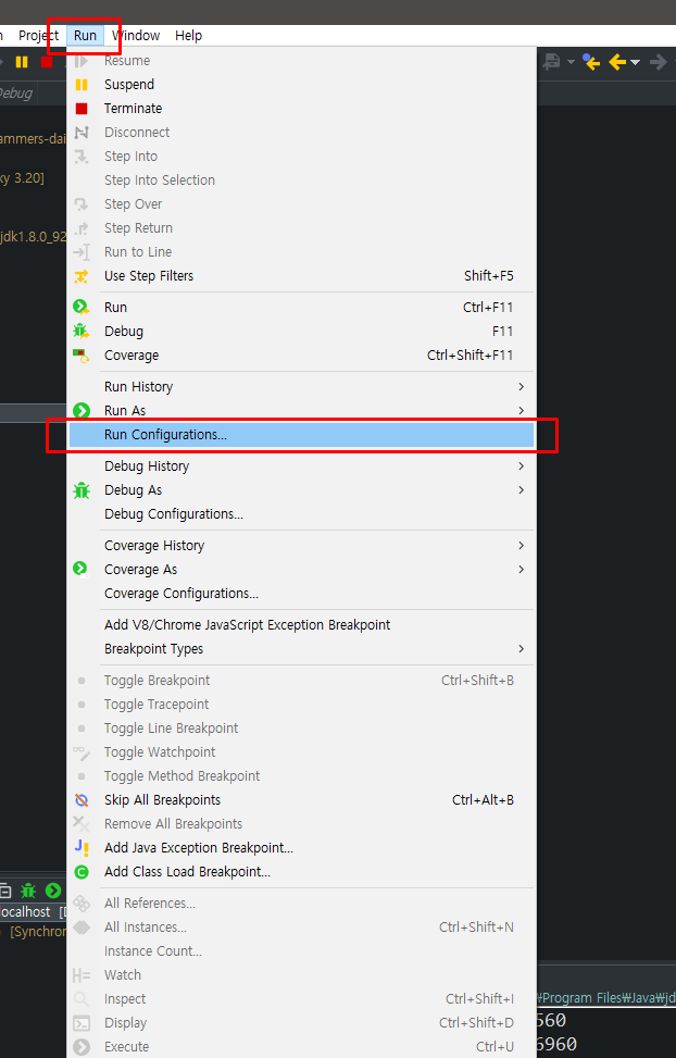 1. 이클립스에서 "Run Configurations..."를 클릭하여 열어준다.