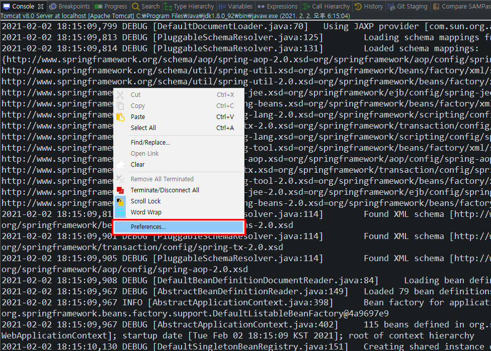 1. Console화면에서 우클릭을 한 뒤 "Preferences"로 들어간다.