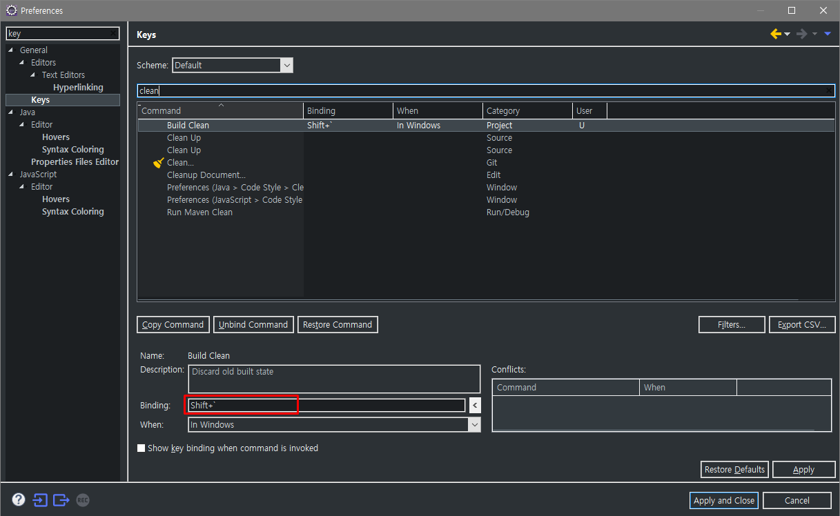 4. 그러면 Clean이 Shift + `로 설정됨을 알 수 있다. ( 자신이 원하는 키로 해도 된다. )