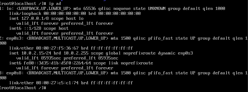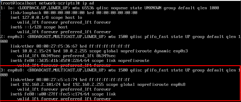 3) enp0s8에 대한 설정을 마친 뒤 "ip address"를 입력한 상태