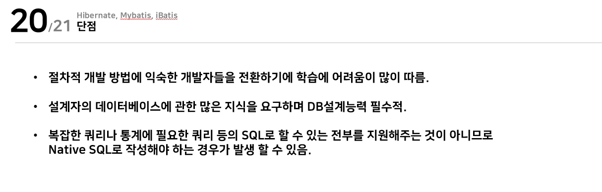 중간에는 기존의 Mybatis 비교를 하는 ppt인데 회사 코드가 있어 올리지는 못한다. 장점과 단점을 비교는 아래의 그림 참조.