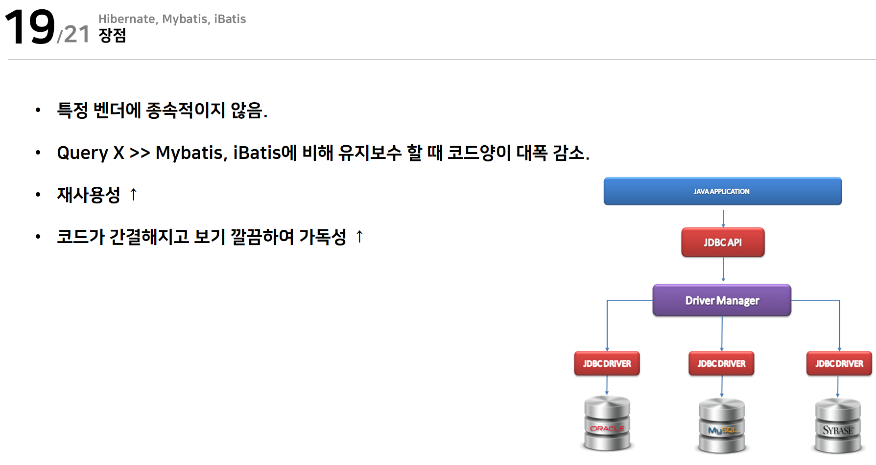 일단 특정 벤더에 종속적이지 않고, 여러 데이터베이스를 큰 어려움없이 바꿔도 문제가 없다. 단, 관계형 데이터 베이스에만 국한된다. 다른 NoSQL이라던지 싱크 맞추는데 손이 좀 간다.
