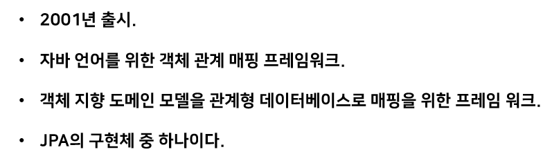 JPA의 구현체 중 하나의 프레임워크이며, 객체 지향 모델을 위한 프레임워크이다.
