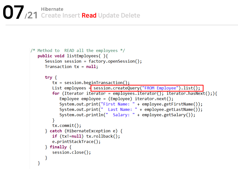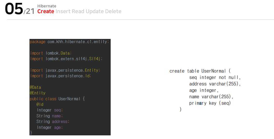 오른쪽이 네이티브 쿼리인데, 이것을 하이버네이트를 이용하면 왼쪽과 같이 짜면 동일하게 동작한다.