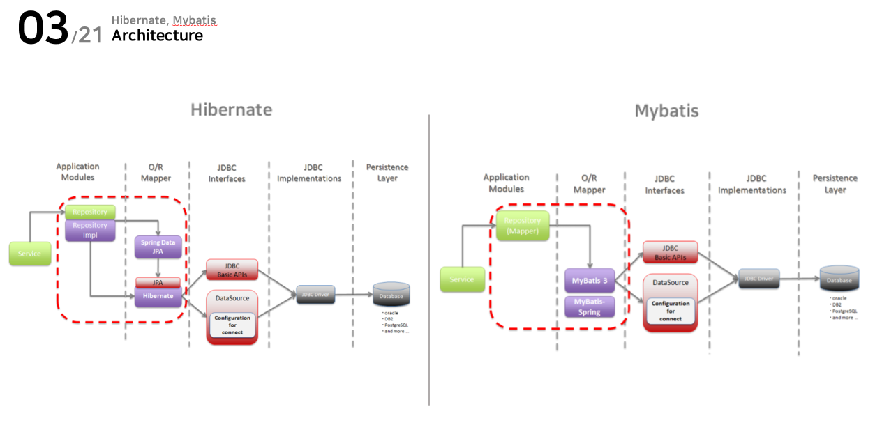 Mybatis에 익숙한 사람들이라면, Mybatis 구조가 들어가는 자리에 Hiberante가 들어오는 구조라고 이해하면 된다.