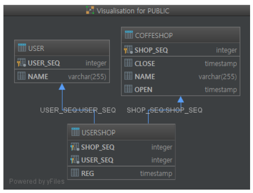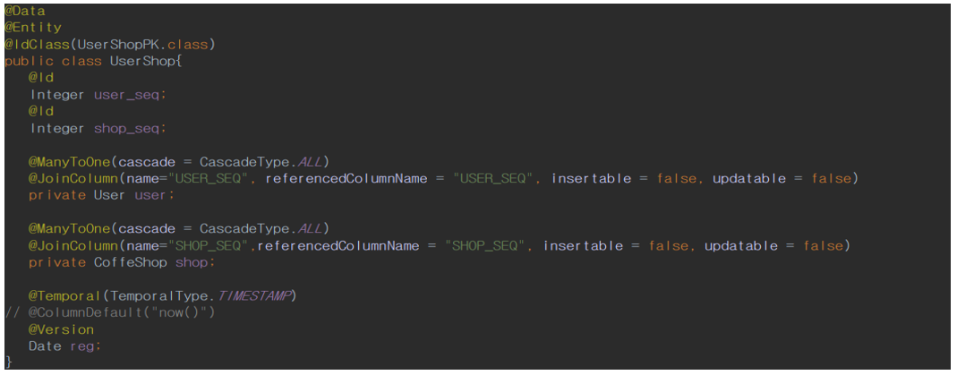 대충 이러한 N:N 구조를 짜려면 Entity가 4개 정도가 선언되어야 한다. 이 작업이 가장 큰 장애물이라고 할 수 있다. 이 장애물만 넘는다면 그 후에는 update, insert 등 함수만 사용하면 된다 .