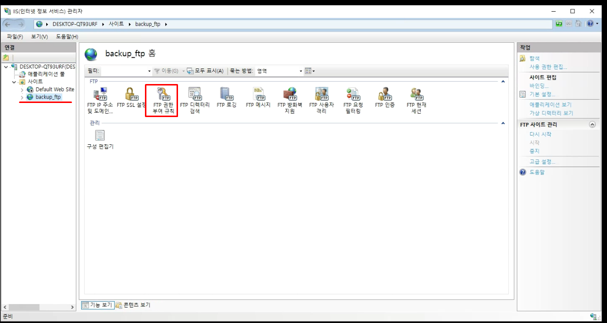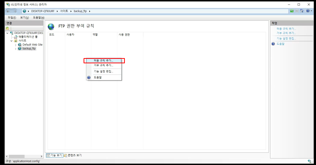 14. 이제 생성된 사용자를 FTP권한을 부여하는 작업, IIS 관리 툴로 돌아와서 "FTP 권한 부여 규칙"을 선택한다.