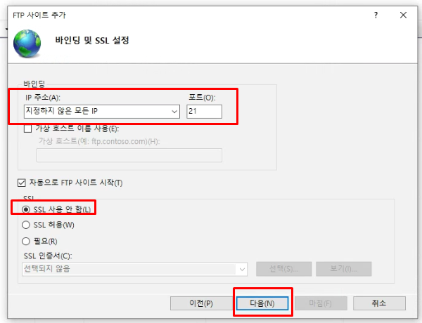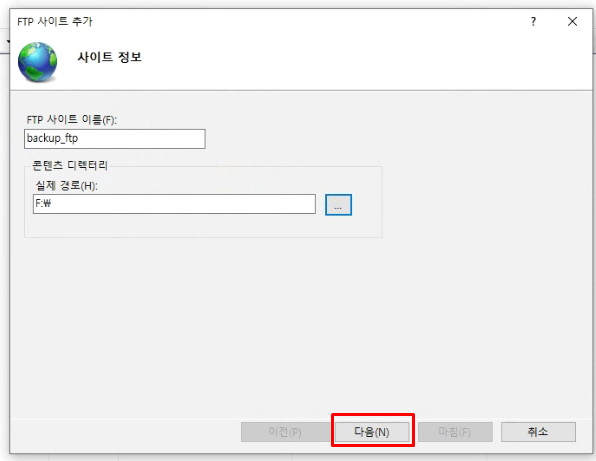 8. ftp 루트 경로 설정과 이름을 설정하고 다음을 눌러준다.