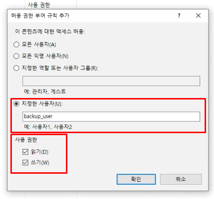 16. 지정한 사용자로 옵션을 넣어 읽기와 쓰기 권한을 부여한다.