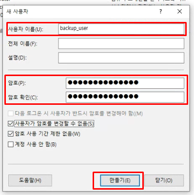 13. 계정명과 암호를 설정하고 기타 옵션은 각자 맞게 설정.