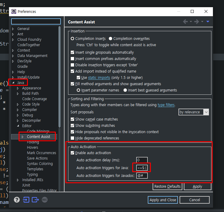 [Eclipse - tip] 자동완성(Ctrl + Space bar) 자동으로 나오게 하기