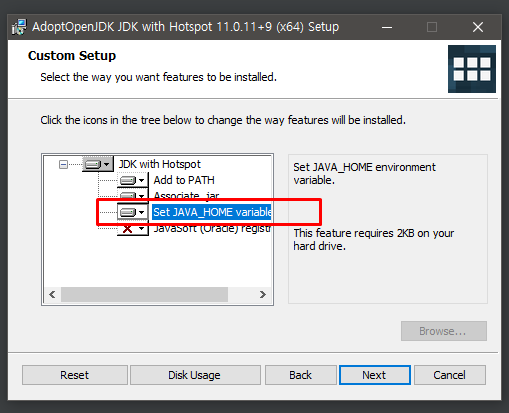 "Set JAVA_HOME variable" 옵션은 환경변수 등록해주는 것이기 때문에 선택을 해준다.