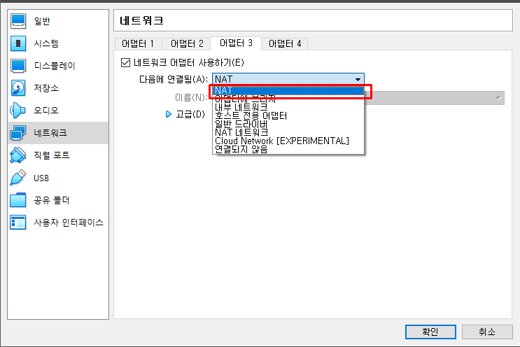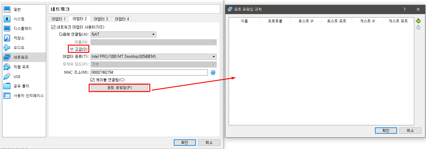 NAT는 보통 포트 포워딩 설정을 하게되면 아래 그림과 같이 고급을 눌러 진행을 하는데 설정을 바꿀 수 있는 것은 이게 전부이다. 하지만 "NAT 네트워크"는 조금 다르다. 아래의 "2번 NAT 네트워크"를 참고.
