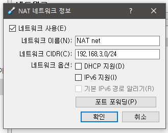NAT 네트워크는, NAT와 달리 맨 위 도표에서도 간략하게 요약이 되었는데 내부적으로 정해진 10.0.2.2 게이트웨이 형식을 쓰는 것이 아니라 직접 설정을 할 수 있다. "호스트 전용 어댑터"와 유사하다고 보면 된다.