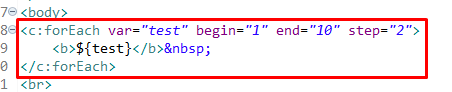 - <c:forEach var="변수명" begin="시작 인덱스" end="끝 인덱스" step="증감식"></c:forEach>
