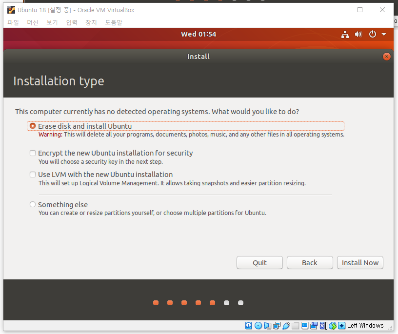 모든 디스크 삭제 후 설치 옵션으로 시작 (어짜피 처음 설치 과정이라 기존 디스크에 자료 없음)