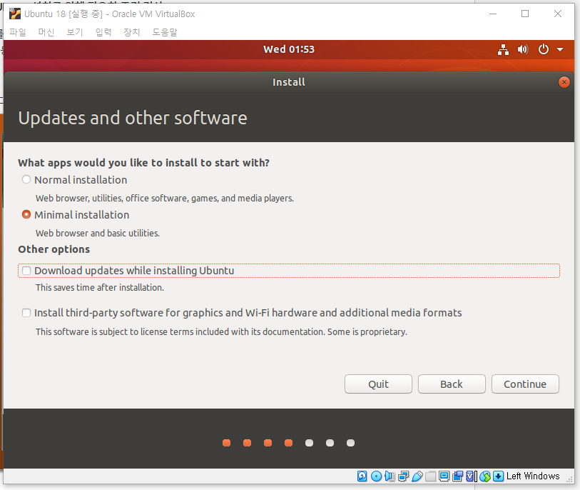 미니멀 버전으로 설치할 것이고, 다른 옵션들은 해제 할 예정. 테스트 할 버전은 18.04.05