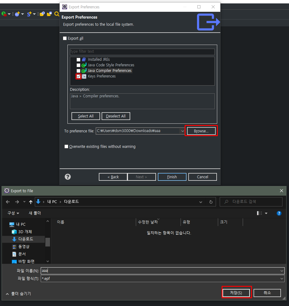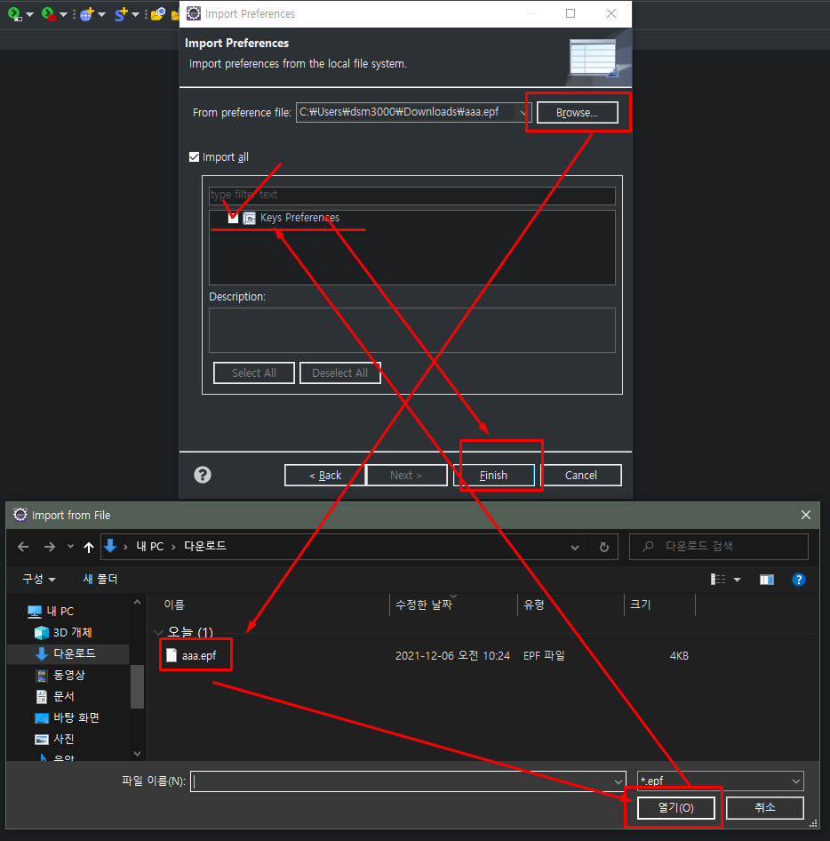 생성된 "aaa.epf"파일을 import를 하면 다른 Workspace의 키세팅이 적용된다.