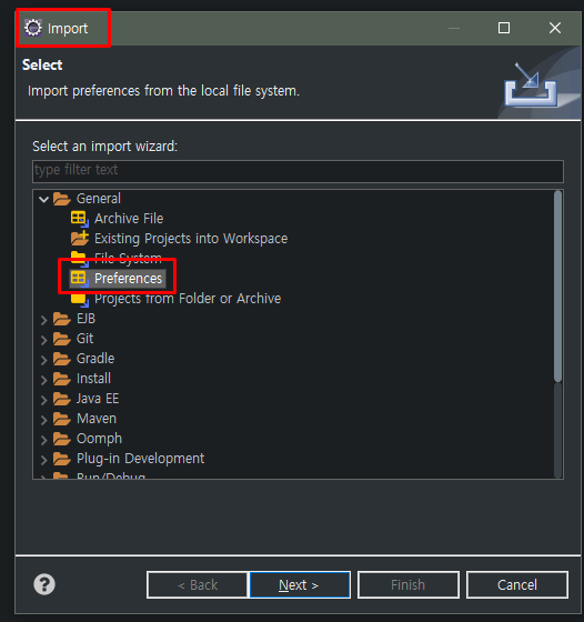 "File-Import" Export대신 Import를 선택하여 아래의 화면과 같이 Preferences를 선택한다.