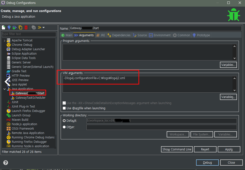 4. 아래의 그림과 같이 "-Dlog4j.configurationFile=" 설정을 넣어줘서 java 실행 시, 경로를 찾도록 명시해준다.