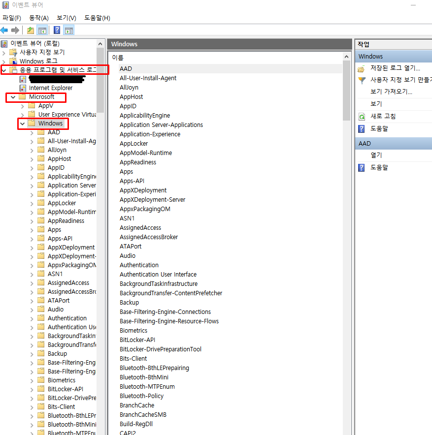 순서 2. 응용 프로그램 및 서비스 로그 - Microsoft - Windows로 진입.