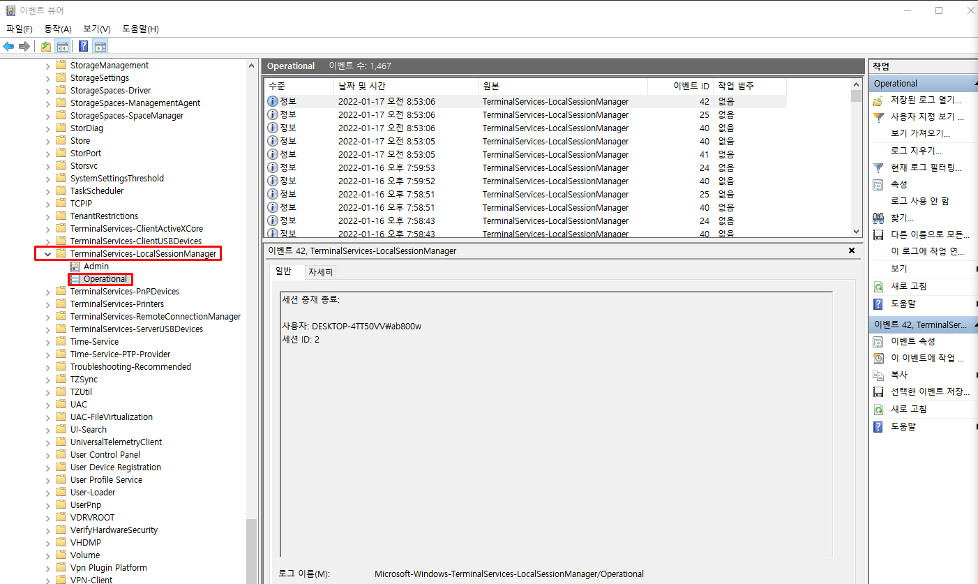 순서 3. 그러면 목록이 많이 나오는데 여기서도 "TerminalServices-LocalSessionManager - Operational"을 선택한다.