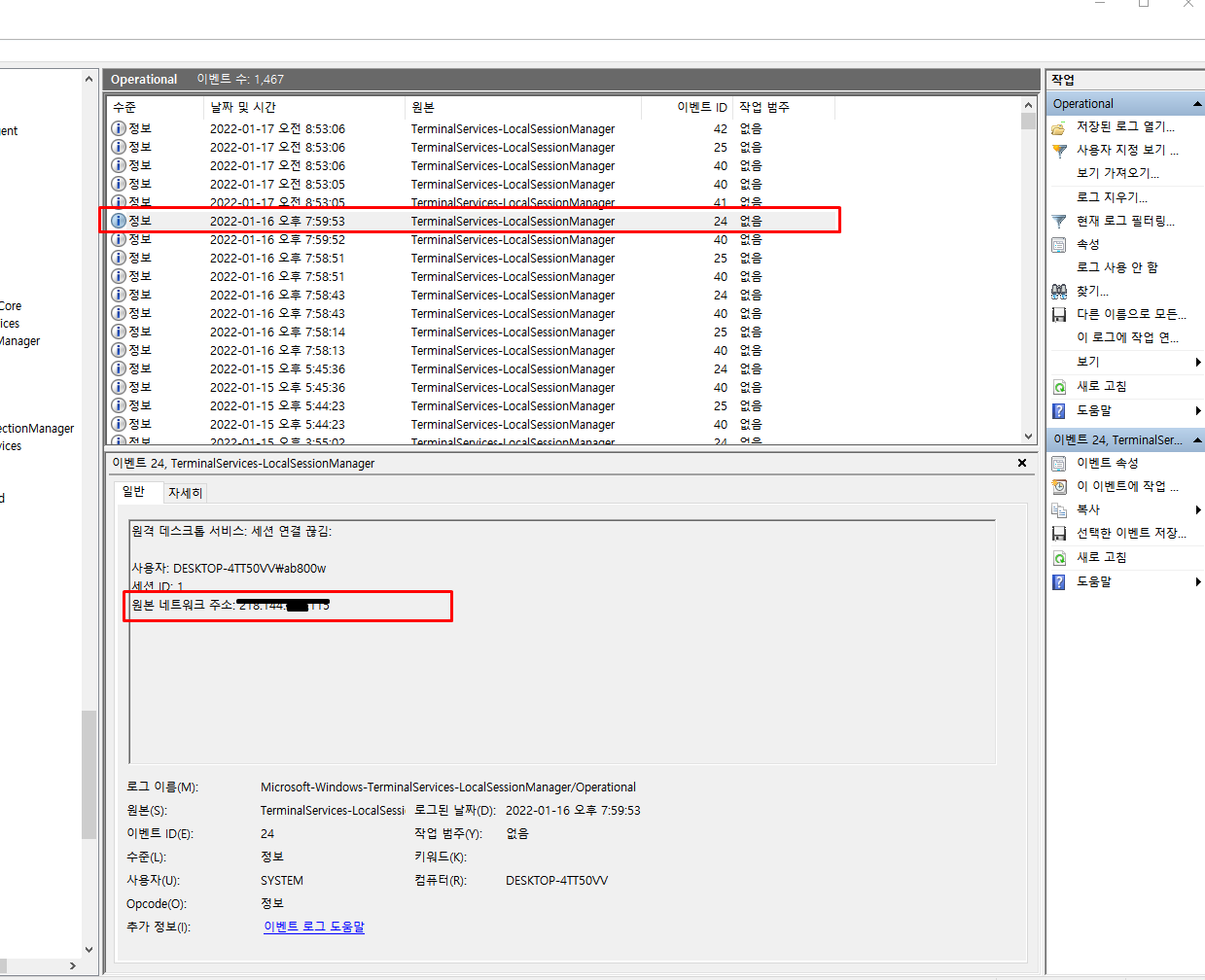 순서 4. 이벤트 로그 마다 보면 이렇게 사용자와, 접속 네트워크 정보가 확인된다.