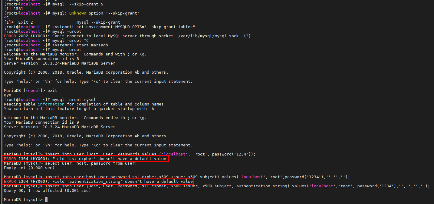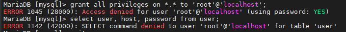 이렇게 root를 추가하게되어도 systemctl set-environment MYSQLD_OPTS=' '을 한 뒤에 들어가서 grant 작업을 하면 권한이 없다고 아래와 같은 참 난감한 상황이 나온다.