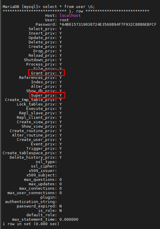 MariaDB [(none)]> SELECT Host,User,Grant_priv,Super_priv FROM mysql.user;