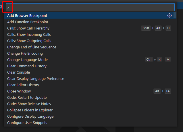 단축키를 누르게되면 아래의 검색창이 나오는데 ">"표시는 명령어들을 검색할 수 있는 프롬프트라고 보면 되겠다.