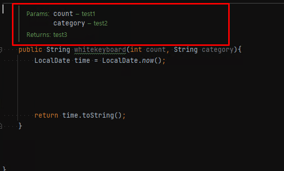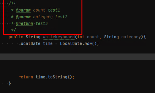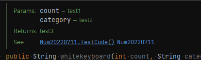 위에서 보이는 태그들이 있는데 "@param, @return"이 있다. 같은 태그를 각각 쓰게되면 하나로 묶여 렌더링이 되며, "@return"의 경우 "@param"과 비슷하게 쌍따옴표가 나오면서 설명 할 수 있는 기본적인 구조가 제공된다.