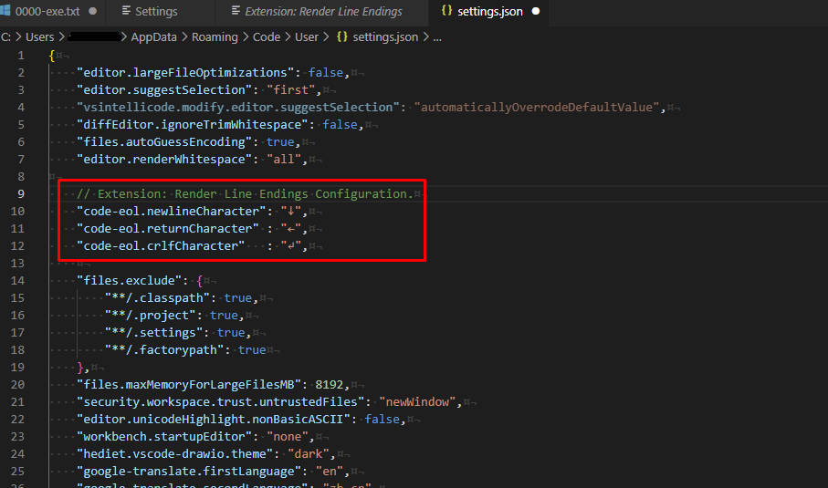VS Code settings에서 기본적으로 세팅이 있을법도 한데. 없다.. 정말로 없다. 다만, whitespace를 보여주고 말고는 있지만, EOL처리를 시각적으로 보여주는 옵션은 정말 없다.
