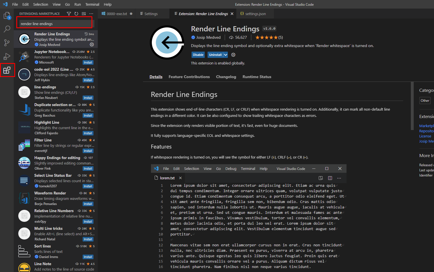 VS Code를 실행해서 Extendtions market에서 "Render Line Endings"을 검색하여 install을 진행한다.
