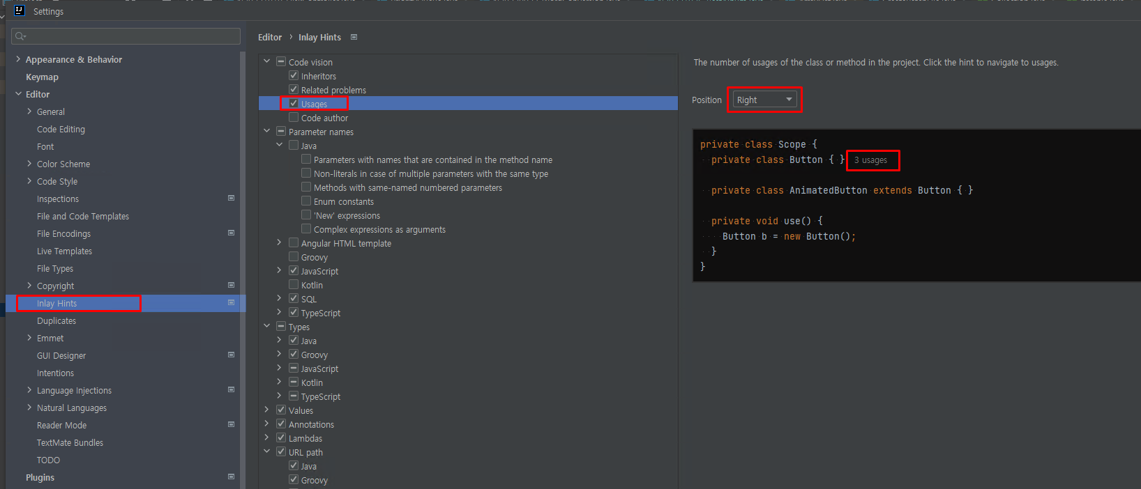 [IntelliJ] Inlay Hints : "usages" 설정하기