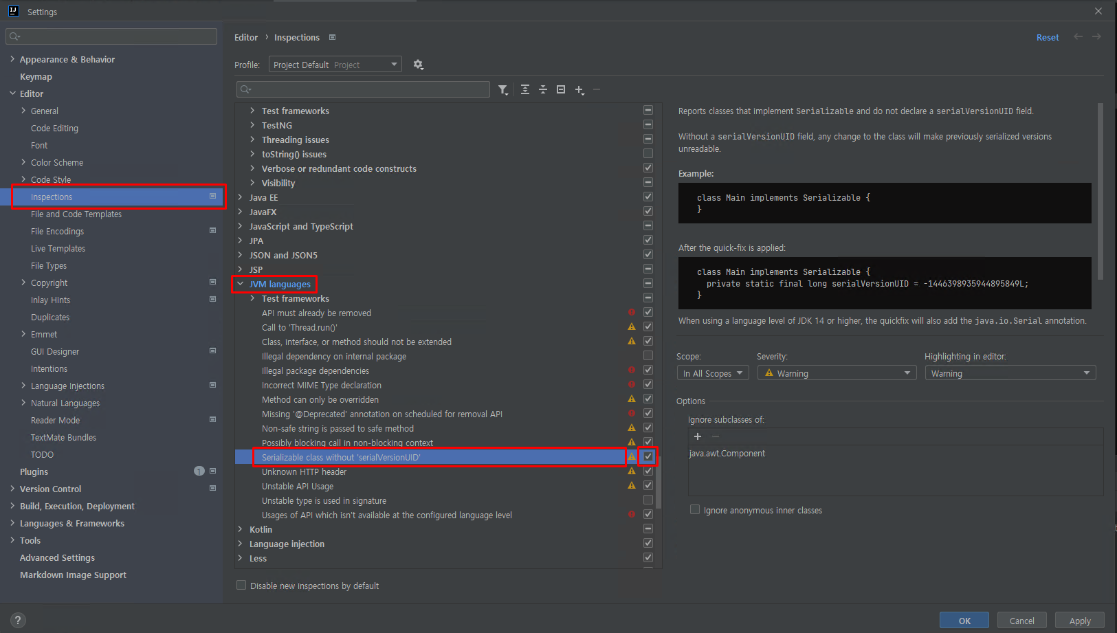 먼저 설정창에서 "Inspections"를 열어준 뒤, "JVM languages", "Serializable class without serialVersionUID'" 항목을 열어준다.